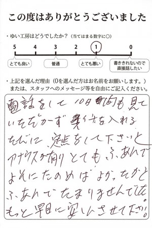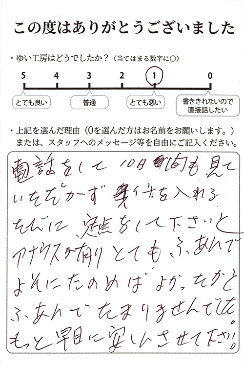 新潟市北区K様のお声(給湯器エラー) 電話をして10日間も見ていただかずスイッチを入れるたびに点検をしてくださいとアナウンスがありとてもふあんでよそに頼めばよかったかとふあんでたまりませんでした。 もっと早めに安心させて下さい。2025年3月症状:給湯器エラー(メーカー法定点検)内容:メーカーへ点検依頼。費用:約10,000円(メーカーの出張・点検費)