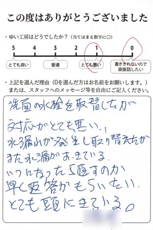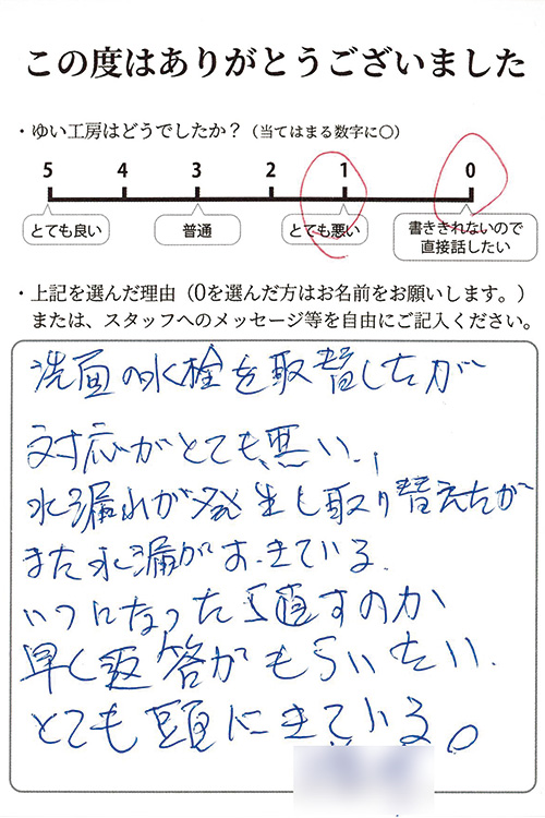 新潟市北区M様のお声(洗面水栓取替え) 洗面の水栓を取替えしたが対応がとても悪い。 水漏れが発生し取替えたがまた水漏れが起きている。いつになったら直すのか早く返答がもらいたい。 とても頭にきている。2025年3月症状:ゆい工房にて取替えた洗面台のシャワー水栓から水漏れ内容:メーカーにて無償交換したが再度水漏れ。お客様とメーカーとの日程調整に難航費用:約-円