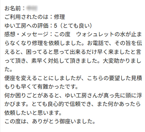 この度 ウォシュレットの水が止まらなくなり修理を依頼しました。