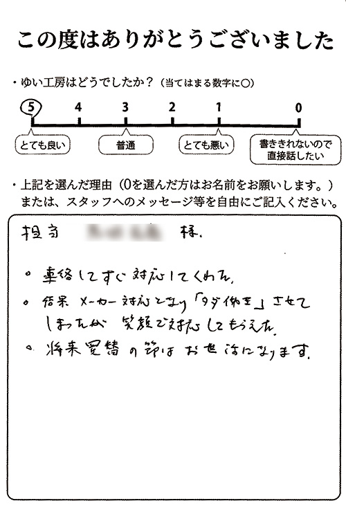 新潟市北区T様のお声(レンジフード修理) 担当(担当者名)様 ・連絡してすぐ対応してくれた ・結果メーカー対応となり「タダ働き」させてしまったが、笑顔で対応してもらえた。 ・将来買い替えの際はお世話になります。2025年4月症状:レンジフードの点検ランプが点灯内容:メーカーにて部品交換修理費用:約30,000円(メーカー出張費、作業費)