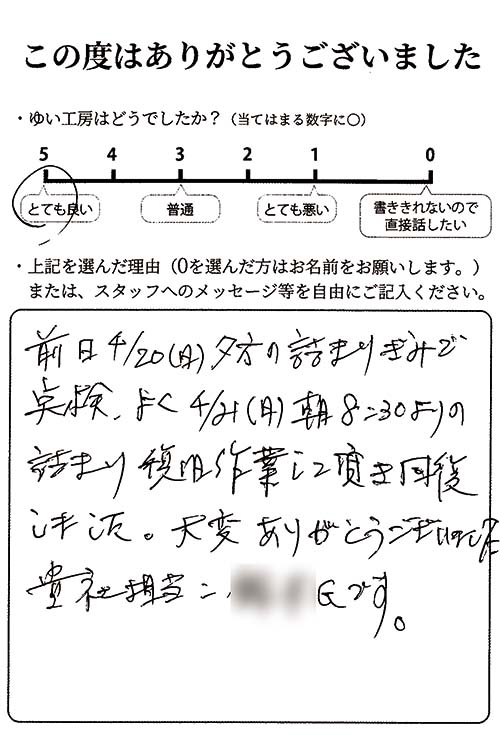 前日4/20(日)夕方のつまり気味で点検、翌4/21(月)朝8:30よりの詰まり復旧工事していただき回復しました。大変ありがとうございました。