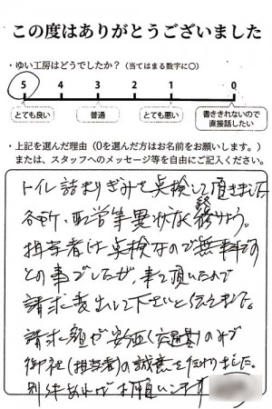 トイレつまり気味を点検していただきました。各所、配管等異常なく終了。