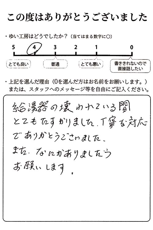 給湯器の壊れている間とても助かりました。丁寧な対応でありがとうございました。