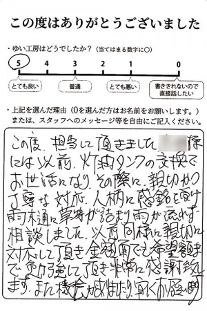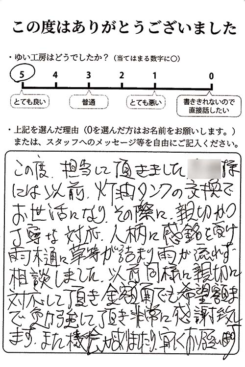 この度、担当していただきました(スタッフ名)様には以前、灯油タンクの交換でお世話になり、その際に親切かつ丁寧な対応、人柄に感銘を受け、雨樋に草等が詰まり雨が流れず相談しました。