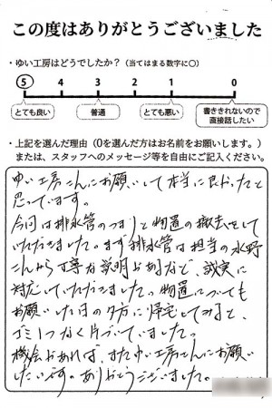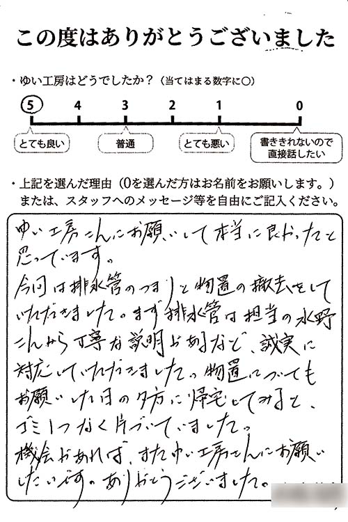 新潟市東区S様のお声(洗面台つまり、物置撤去) ゆい工房さんにお願いして本当に良かったと思っています。今回は排水管のつまりと物置の撤去をしていただきました。 まず排水管は担当の(担当者名)さんから丁寧な説明があるなど誠実に対応していただきました。物置についてもお願いした日の夕方に帰宅してみるとゴミ一つなく片付いていました。 機会があればまたゆい工房さんにお願いしたいです。ありがとうございました。2025年5月症状:洗面台の排水があふれる内容:根っこ詰まり撤去、追加で物置撤去処分費用:約56,000円(作業費、処分費)