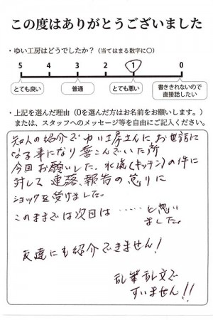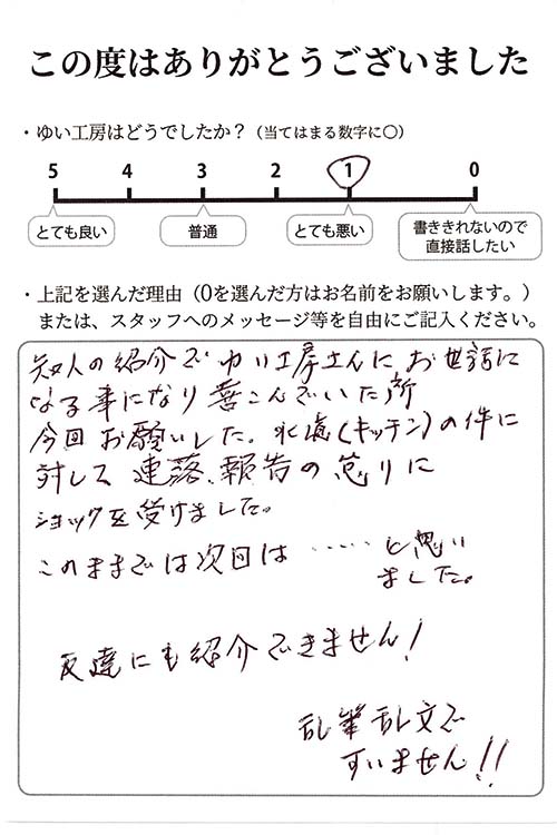 知人の紹介でゆい工房さんにお世話になることになり喜んでいたところ、今回お願いした、水道(キッチン)の件に対して連絡・報告の怠りにショックを受けました。