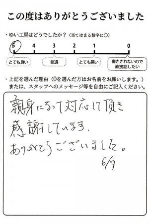 親身になって対応していただき感謝しています。ありがとうございました。