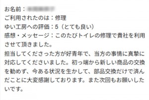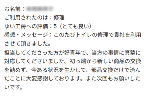 新潟市北区H様のお声(トイレ修理) このたびトイレの修理で貴社を利用させて頂きました。 担当してくださった方が好青年で、当方の事情に真摯に対応してくださいました。 初っ端から新しい商品の交換を勧めず、今ある状況を生かして、部品交換だけで済んだことに大変感謝しております。 また次回もお願いしたいです。2025年6月