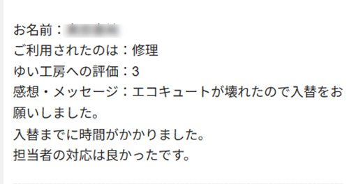エコキュートが壊れたので入替をお願いしました。入替までに時間がかかりました。 担当者の対応は良かったです。