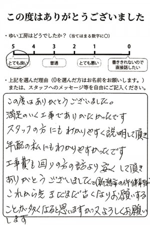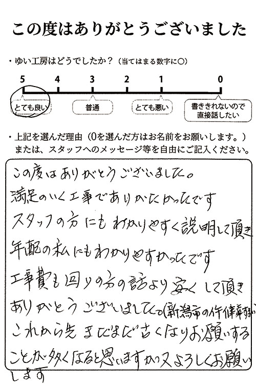 新潟市北区U様のお声(トイレ取替え、お風呂修理) この度はありがとうございました。 満足の行く工事でありがたかったです。 スタッフの方にもわかりやすく説明していただき、年配の私にもわかりやすかったです。工事費もまわりの方の話より安くしていただき、ありがとうございました。(新潟市の健幸すまい) これから先、まだまだ古くなりお願いすることが多くなると思いますが、またよろしくお願いします。2025年6月