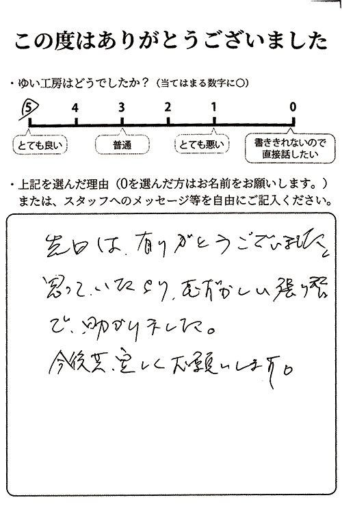 先日はありがとうございました。思っていたより難しい張替えで助かりました。 今後ともよろしくお願いします。