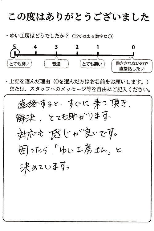 連絡するとすぐに来ていただき、解決、とても助かります。対応も感じが良いです。 困ったら「ゆい工房さん」と決めています。