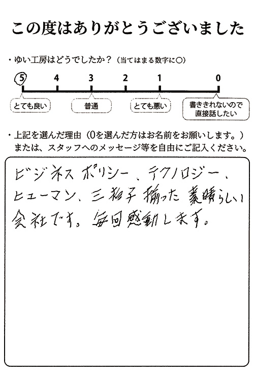 ビジネスポリシー、テクノロジー、ヒューマン、三拍子揃った素晴らしい会社です。毎回感動します。