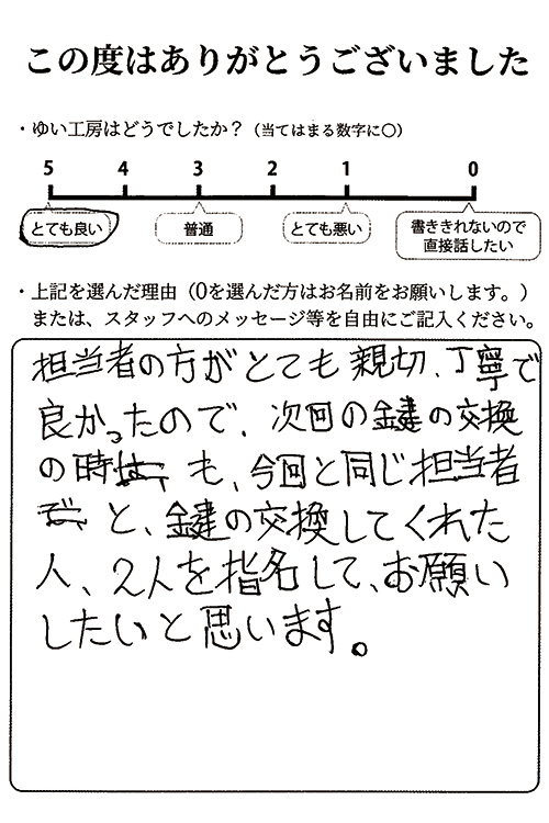 担当者の方がとても親切丁寧で良かったので、次回の鍵の交換のときも、今回と同じ担当者と、鍵の交換をしてくれた人、2人を指名してお願いしたいと思います。