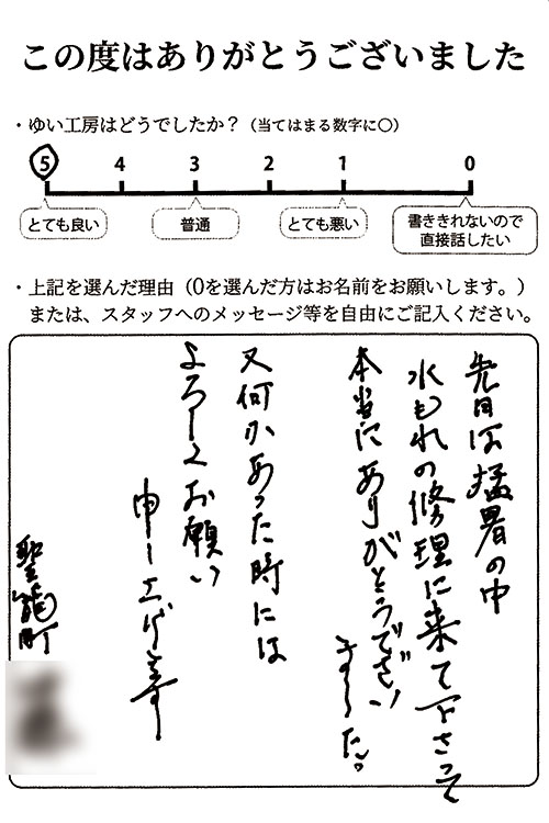 先日は猛暑の中水漏れの修理に来てくださって本当にありがとうございました。また何かあったときにはよろしくお願い申し上げます。