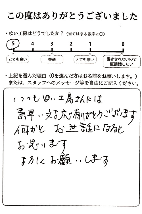 いつもゆい工房さんには素早い対応ありがとうございます。なにかとお世話になると思います。よろしくお願いします。