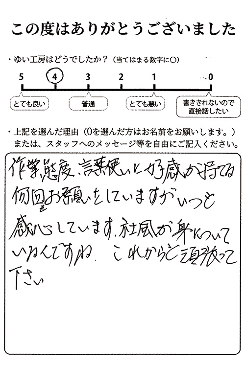 作業態度、言葉遣いに好感が持てる。何回もお願いしていますがいつも感心しています。社風が身についているんですね。これからもがんばってください。