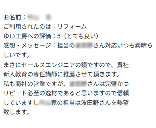 新潟市北区N様のお声(玄関照明取替え) 担当の(担当者名)さん対応いつも素晴らしいです。まさにセールスエンジニアの鏡ですので、貴社新人教育の専任講師に推薦させて頂きます。 私も商社の営業ですが、(担当者名)さんは完璧かつリピート必至の逸材であると思いますので信頼していますしN家の担当は(担当者名)さんを熱望致します。2025年8月