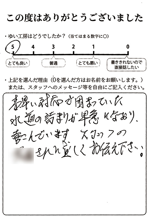 素早い対応で困っていた水道のつまりが早急に直り喜んでいます。スタッフの(担当者名)さんによろしくお伝え下さい。