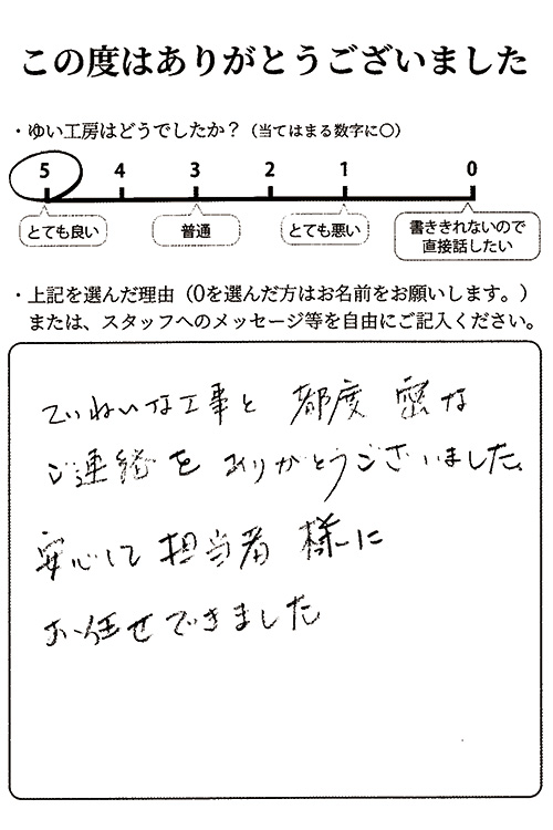 ていねいな工事と、都度 密なご連絡をありがとうございました。安心して担当者様にお任せできました。