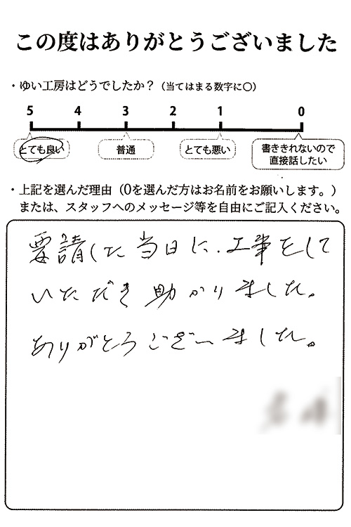 要請した当日に工事をしていただき助かりました。ありがとうございました。