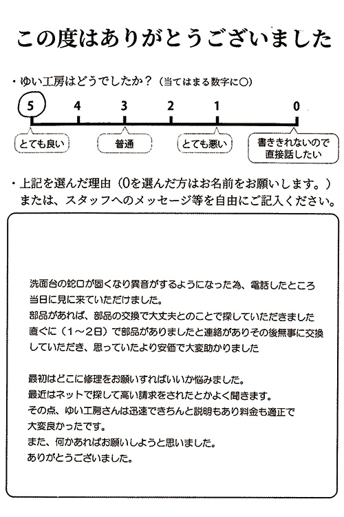 洗面台の蛇口が固くなり異音がするようになったため、電話したところ当日に見に来ていただけました。部品があれば部品交換で大丈夫だとのことで探していただきました。