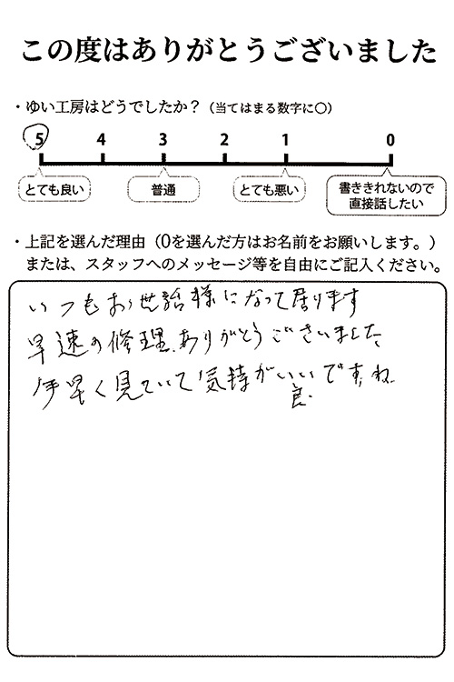 いつもお世話になっております。さっそくの修理ありがとうございました。手早く見ていて気持ちが良いですね。