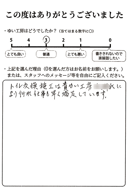 トイレ交換施工は貴ゆい工房の(担当者名)氏により行われ仕事も早く満足しています。