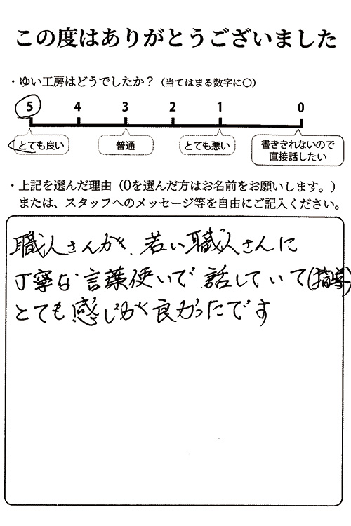 職人さんが、若い職人さんに丁寧な言葉づかいで話していて(指導)とても感じが良かったです。