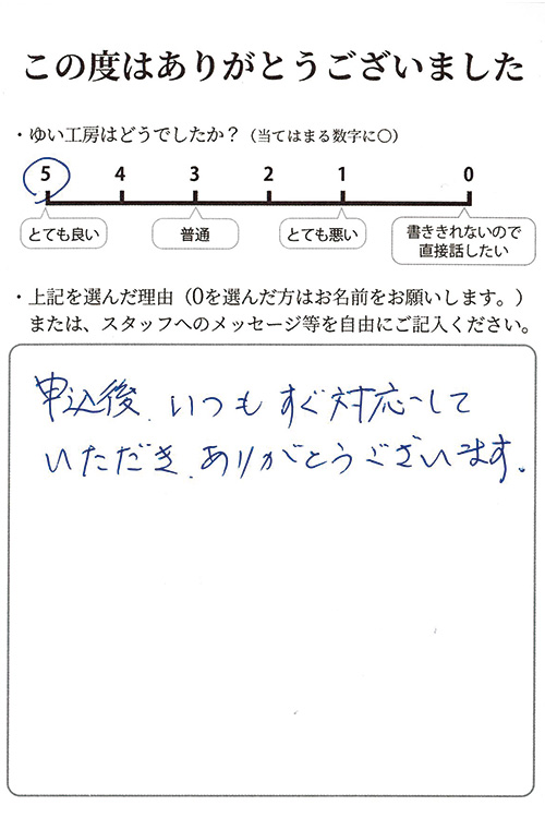 申込後、いつもすぐに対応していただき、ありがとうございます。