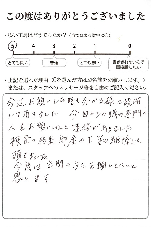 新潟市北区Sのお声(シロアリ防除) 今までお願いしたときもわかるように説明していただきました。今回もシロアリの専門の人をお願いしたと連絡がありました。 検査の結果部屋の下等も駆除していただきました。今度は玄関の方をお願いしたいと思います。2025年10月