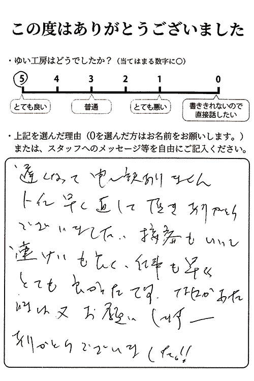 新潟市北区Aのお声(トイレ修理) 遅くなって申し訳ありません、トイレ早く直していただきありがとうございました。接客もいいし連携もよく、仕事も早く、とても良かったです。 何かあったときはまたお願いします。ありがとうございました!!2025年11月