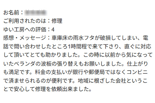 新潟市北区S様のお声(ベランダ波板修理等) 車庫床の雨水フタが破損してしまい、電話で問い合わせしたところ1時間程で来て下さり、直ぐに対応して頂いてとても助かりました。 この時に以前から気になっていたベランダの波板の張り替えもお願いしました。仕上がりも満足です。 料金の支払いが銀行や郵便局ではなくコンビニで済ませられるのが便利です。地域に根ざした会社ということで安心して修理を依頼出来ました。2025年11月