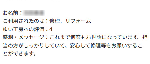 これまで何度もお世話になっています。担当の方がしっかりしていて、安心して修理等をお願いすることができます。