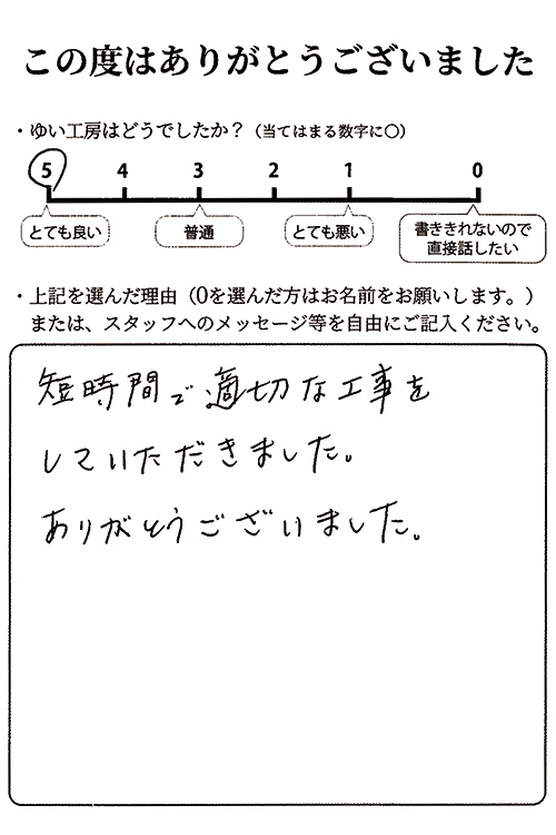 短時間で適切な工事をしていただきました。ありがとうございました。
