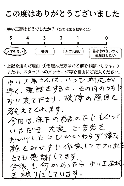 新潟市北区K様のお声(給湯配管修理) ゆい工房さんはいつも対応が早く、電話をするとその日のうちに見に来てくださり、故障の原因を教えてくれます。 今回は床下の縁の下に潜っていただき、大変ご苦労をおかけしたにも関わらず嫌な顔を見せずに作業してくださいました。とても感謝しています。 今後もなにかあったらゆい工房さんを頼りにしています。2025年12月