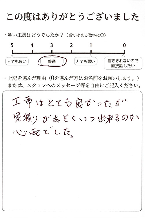 工事はとても良かったが見積もりが遅くいつできるのか心配でした。