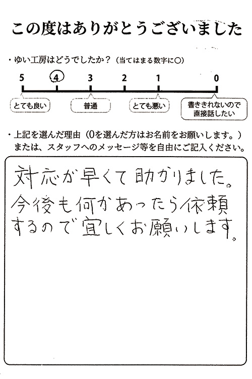 対応が早くて助かりました。今後もなにかあったら依頼するので宜しくお願いします。