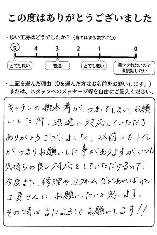 キッチンの排水口が詰まってしまい、お願いしたところ、迅速に対応していただきありがとうございました。