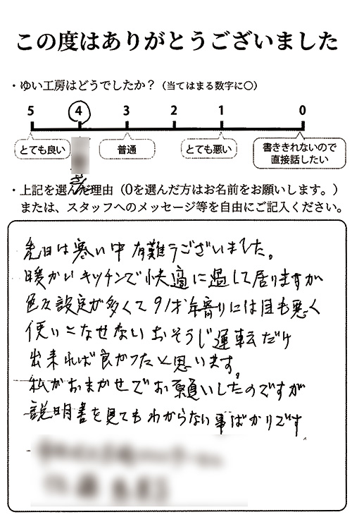 新潟市北区S様のお声(エアコン取替え) 先日は寒い中有難うございました。 暖かいキッチンで快適に過ごして居りますが色々設定が多くて91才年寄りには目も悪く使いこなせない。 おそうじ運転だけ出来れば良かったと思います。 私がおまかせでお願いしたのですが説明書を見てもわからない事ばかりです。2025年12月