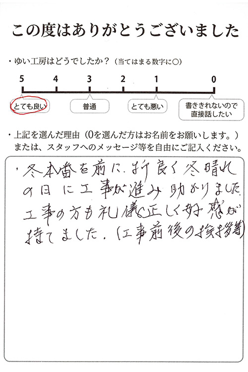 冬本番を前に、折良く冬晴れの日に工事が進み助かりました。 工事の方も礼儀正しく好感が持てました。(工事前後の挨拶等)