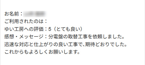 分電盤の取替工事を依頼しました。迅速な対応と仕上がりの良い工事で、期待どおりでした。