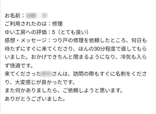 新潟市北区K様のお声(吊戸扉修理) つり戸の修理を依頼したところ、何日も待たずにすぐに来てくださり、ほんの30分程度で直してもらいました。おかげできちんと閉まるようになり、冷気も入らず快適です。 来てくださった鈴木さんは、訪問の際もすぐに名刺をくださり、大変感じが良かったです。 また何かありましたら、ご依頼しようと思います。ありがとうございました。2025年12月