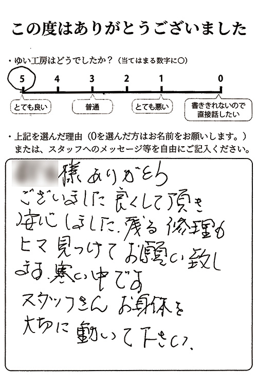 (担当者名)様 ありがとうございました。良くして頂き安心しました。残る修理もヒマ見っけてお願い致します。寒い中ですがスタッフさんお身体を大切に動いて下さい。
