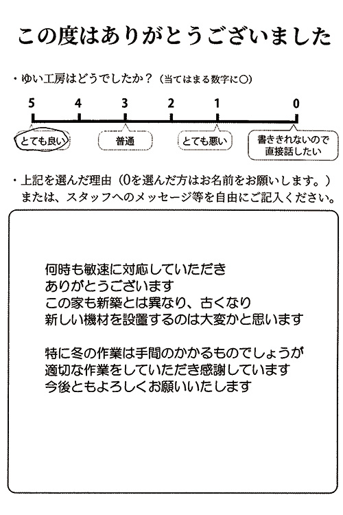 新潟市北区I様のお声(給湯器取替え) 何時も敏速に対応していただきありがとうございます。この家も新築とは異なり、古くなり新しい機材を設置するのは大変かと思います。 特に冬の作業は手間のかかるものでしょうが適切な作業をしていただき感謝しています。今後ともよろしくお願いいたします。2026年1月