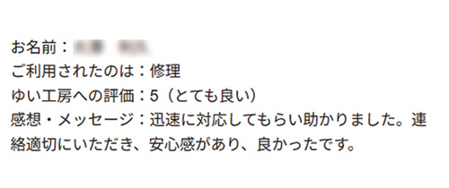 迅速に対応してもらい助かりました。連絡適切にいただき、安心感があり、良かったです。