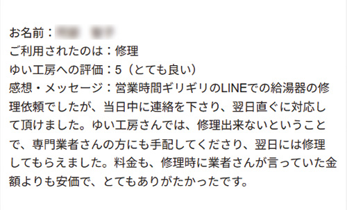 新潟市北区A様のお声(給湯器修理)評価5(とても良い)