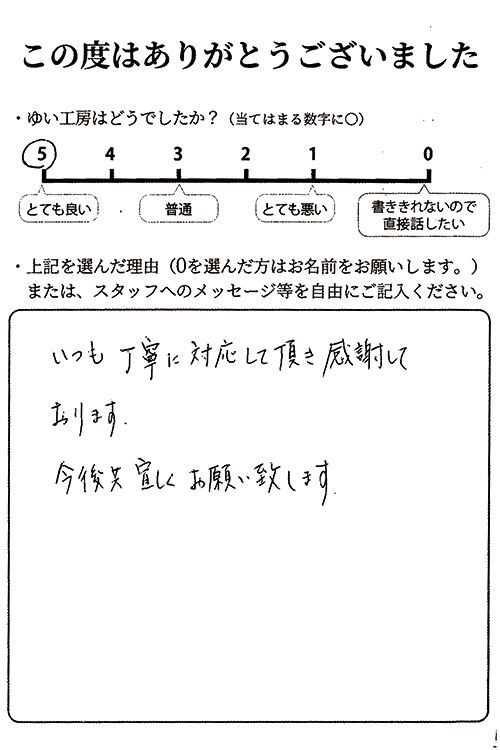 いつも 丁寧に対応して頂き感謝しております。今後共 宜しくお願い致します。